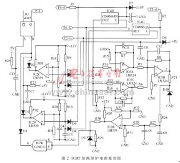 由對圖1所示電路的分析,可以得到IGBT短路保護電路的原理電路圖,如圖2所示。在圖2所示電路中, IC4及其外圍器件構成選通邏輯電路,由IC5及其外圍器件構成濾波及放大電路,IC2及其外圍器件構成門限比較電路,IC1及其外圍器件構成保持電路。正常情況下,D1、D2、D3的陰極所連接的IC2D、IC2C及CD4011的輸出均為高電平,IC1的輸出狀態不會改變。假設由于某種原因,在給T2發驅動信號的時候,H型橋式PWM變換電路的左半橋下管T2的管壓降異常升高(設電平值為“高”),即T2-d端電壓異常升高,則該高電平UT2-d通過R2加在D8的陰極;同時,發給T2的高電平驅動信號也加在二極管D5的陰極。對IC2C來說,其反相輸入端為高電平,若該電平值大于同相輸入端的門檻電平值的話,則IC2C輸出為“低”。該“低”電平通過D2加在R-S觸發器IC1的R輸入端,使其輸出端Q的輸出電平翻轉,向控制系統發出IGBT故障報警信號。如果是由于右半橋下管T4的管壓降異常升高而引起IC2D輸出為“低”,則該“低”電平通過D1加在R-S觸發器IC1的R輸入端,使其輸出端Q的輸出電平翻轉,向控制系統發出IGBT故障報警信號。由IC5A和IC5C及其外圍器件構成的濾波及放大電路將選通電路送來的描述IGBT管壓降的電壓信號進行預處理后,送給由IC5B構成的加法器進行運算處理。若加法器的輸出電平大于由R22和R32確定的門檻電平,則會使R-S觸發器IC1的R端的第三個輸入端為“低”,也向控制系統發出IGBT故障報警信號。改變由R22和R32確定的門檻電平,就可以靈活地改變這第三路報警信號所代表的物理意義,從而靈活地設計保護電路。圖2中的端子T4-d、T2-d,分別接在T4、T2的集電極上,T4-G、T2-G分別接IGBT器件T4、T2的驅動信號。在電路設計時應該特別注意的是,D8、D5、D9、D4必須采用快速恢復二極管。