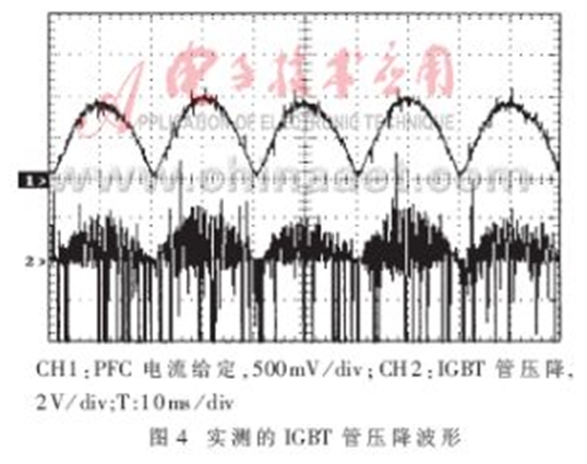 當圖1所示的PWM變換器工作在單相高頻整流模式下,應用PSPICE仿真軟件對圖2所示的電路進行仿真研究,可以得到如圖3所示的結果。圖3所示的仿真波形相當于在圖2電路中IC5B的第7腳觀察到的信號波形。仿真結果表明,檢測電路可以快速、有效地將PWM變換器的下管導通時的管壓降檢測出來。圖4所示波形是實際電路工作時檢測到的相關波形。圖中,1#通道顯示的是單相高頻整流電感電流的給定波形,2#通道顯示的是實際檢測到的圖2電路中IC5B的第7腳的工作波形。比較圖3和圖4可以得出,該檢測電路可以快速、有效地檢測出IGBT導通時的管壓降,從而對IGBT實施有效的保護。