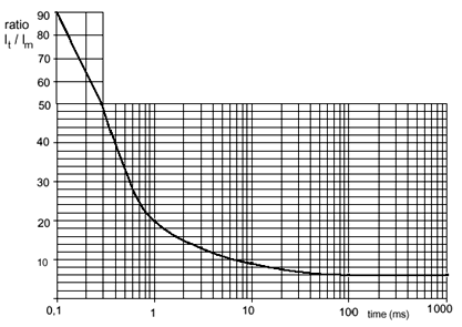 歐洲電信標(biāo)準(zhǔn)協(xié)會(huì)(the European Telecommunications Standards Institute)對(duì)用于通信系統(tǒng)的開關(guān)電源的沖擊電流大小做了規(guī)定,圖3為通信系統(tǒng)用AC/DC電源供電時(shí)的最大沖擊電流限值[4],圖4為通信系統(tǒng)在DC/DC電源供電,標(biāo)稱輸入電壓和最大輸出負(fù)載時(shí)的最大沖擊電流限值[5]。圖中It為沖擊電流的瞬態(tài)值,Im為穩(wěn)態(tài)工作電流。