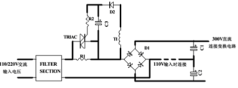 在這種可控硅啟動(dòng)電路中,很容易通過開關(guān)電源主變壓器上的一個(gè)線圈來給可控硅供電。由開關(guān)電源的緩啟動(dòng)來提供可控硅的延遲啟動(dòng),這樣在電源啟動(dòng)前就可以通過電阻R1將輸入電容充滿電。