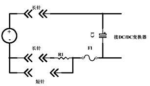 圖7所示電路為長短針法沖擊電流限制電路,在DC/DC電源板插入時(shí),長針接觸,輸入電容C1通過電阻R1充電,當(dāng)電源板完全插入時(shí),電阻R1被斷針短路。C1代表DC/DC電源的所有電容量。
