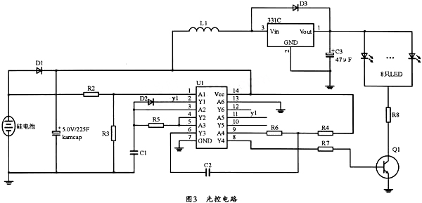 圖3中,U1為帶施密特觸發(fā)器的六反相器74HC14,其中的多諧振蕩器由第二個反相器與R5和C1構(gòu)成。這樣,在白天光線變亮?xí)r,太陽能電池電壓升高,74HC14的1腳為高電平,74HC14的2腳為低電平,8腳同樣輸出低電平,三極管Q1截至,LED關(guān)斷。而當(dāng)光線變暗時,太陽能電池電壓降低到一定程度時,HC14的1腳為低電平,HC14的2腳為高電平,多諧振蕩器開始振蕩,并經(jīng)過Y4輸出高、低電平,Q2時而導(dǎo)通時而截至,此時只要調(diào)節(jié)R6和C1的值,以把閃光頻率調(diào)節(jié)到人眼不能分辨即可,這樣做的最大好處是可以延長草坪燈工作時間。經(jīng)實際測試,該電路可以每天連續(xù)工作10小時以上,完全可以達(dá)到用戶的使用需求。