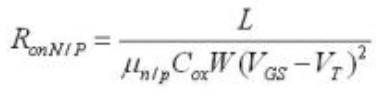 低導(dǎo)通電阻是模擬開關(guān)在音頻切換用途時(shí)的主要選擇因素。值得注意的是,導(dǎo)通電阻是針對(duì)具體的VCC 、VIN(電壓輸入)及給定負(fù)載電流而定義的。在晶體管級(jí),RON為起始長(zhǎng)度(L)、寬度(W)、電子與空穴遷移率、氧化層電容、門限電壓及信號(hào)電壓的函數(shù)。如下所示: