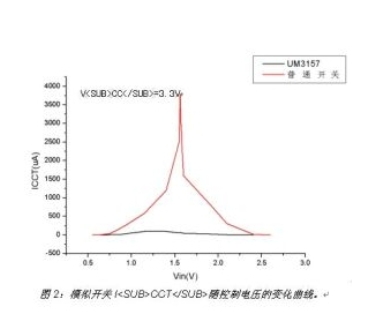 對(duì)于某些開關(guān),電流消耗甚至高達(dá)幾毫安,對(duì)功耗敏感的便攜式設(shè)備而言,這樣的功耗是無(wú)法接受的。大多數(shù)標(biāo)準(zhǔn)模擬開關(guān)的產(chǎn)品說(shuō)明書只給出了典型情況下(即開關(guān)輸入控制信號(hào)的高電平與開關(guān)供電電壓一致)的功耗指標(biāo),這容易讓設(shè)計(jì)工程師感到混淆,他們會(huì)驚奇地發(fā)現(xiàn)在低壓ASIC設(shè)計(jì)中的模擬開關(guān)竟有幾毫安的漏電流。英聯(lián)電子的模擬開關(guān)改善了控制電路的輸入緩沖器,只要芯片的控制輸入電壓大于VIH或小于VIL內(nèi),而不是等于0V或VCC,也能保持非常小的功耗。從圖2可看到采用該技術(shù)的英聯(lián)電子UM3157模擬開關(guān)與普通的同系列模擬開關(guān)在ICCT上的顯著區(qū)別。 [page]