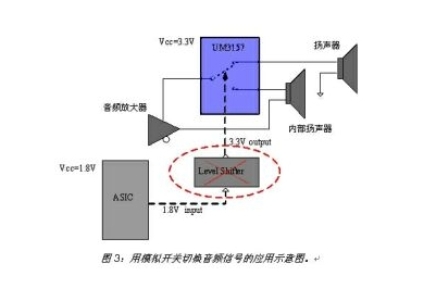 此外,英聯(lián)電子的低ICCT系列模擬開關(guān)具有更低的VIH電平值,可以采用較低的控制電平實(shí)現(xiàn)開關(guān)的高電平切換控制。這種特性大大減少了電路復(fù)雜性,特別是在供電電源和控制信號(hào)電平不匹配的便攜產(chǎn)品應(yīng)用中,可省去電平轉(zhuǎn)換模塊,從而有效降低了成本。以圖3所示的模擬開關(guān)切換音頻信號(hào)為例,如果采用ASIC輸出的1.8V電平作為UM3157控制管腳的輸入,則不必采用電平轉(zhuǎn)移器,就能在漏電流很小的情況下實(shí)現(xiàn)開關(guān)切換。此外,由于低ICCT模擬開關(guān)的電流功耗很低(大約1uA),且開關(guān)的導(dǎo)通電阻隨工作電壓的增加而降低,所以可以采用較高的供電電壓來(lái)實(shí)現(xiàn)更低的導(dǎo)通電阻。低導(dǎo)通電阻對(duì)典型的音頻開關(guān)或USB應(yīng)用而言非常重要。