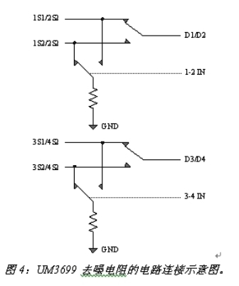 在音頻電路中,當(dāng)模擬開關(guān)斷開時(shí),由于寄生電容和電容失配,電容上的電荷無(wú)法釋放,從而導(dǎo)致耳機(jī)上的噪聲。可以通過(guò)在開關(guān)斷開時(shí)接通一個(gè)去噪電阻,來(lái)快速釋放電荷,從而提高音頻切換質(zhì)量。圖4是英聯(lián)電子的UM3699在開關(guān)切換時(shí)去噪電阻的連接示意圖。