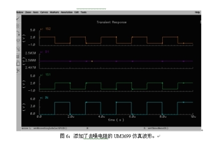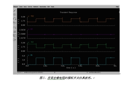 圖5是沒有采用去噪聲電阻時(shí)模擬開關(guān)的仿真波形圖。D1為輸入的數(shù)據(jù)信號(hào)。IN為選擇端信號(hào)。當(dāng)IN為高電平時(shí),開關(guān)通向1S1;當(dāng)IN為低電平時(shí),開關(guān)通向1S2。當(dāng)開關(guān)斷開時(shí),由于寄生電容和選擇端切換脈沖的存在,開關(guān)到地之間是高阻態(tài),所以寄生電容的電荷沒有放電回路。這樣,開關(guān)的關(guān)斷端在較長(zhǎng)的時(shí)間內(nèi)將出現(xiàn)一個(gè)比輸入數(shù)據(jù)信號(hào)更高的電平,從而導(dǎo)致噪聲。圖6是采用圖4中的去噪電阻后開關(guān)切換的仿真波形圖。由于開關(guān)斷開后連接了去噪電阻上,形成一個(gè)對(duì)地的放電回路,所以寄生電容上的電荷得以很快釋放,從而消除了開關(guān)切換時(shí)的干擾電平,提高了開關(guān)在音頻切換應(yīng)用時(shí)的聲音質(zhì)量。
