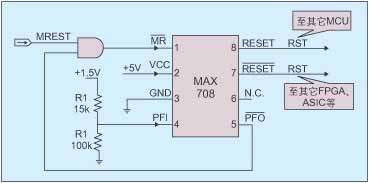 在電路設(shè)計中,MCU單元一般由51單片機(jī)構(gòu)成,單片機(jī)的復(fù)位信號是高有效。一般FPGA和ASIC的復(fù)位信號都是低有效。由于MAX708可同時輸出高電平有效和低電平有效的復(fù)位信號,因此可以利用MAX708的這個特點來解決電路內(nèi)MCU、FPGA、ASIC的上電復(fù)位問題。