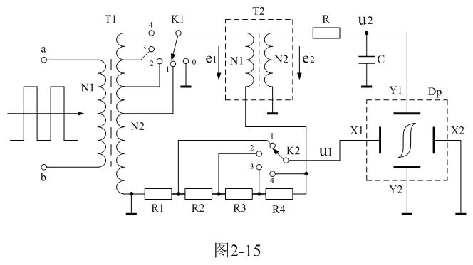 在圖2-15中,變壓器T1為信號源,通過K1選擇變壓器T1次級線圈的抽頭就可以改變信號源的電壓輸出;T2為待測變壓器樣品,Dp為示波器;R1、R2、R3、R4為顯示磁場強度H的取樣電阻,取樣電壓u1作為示波器X軸偏轉顯示輸入電壓,通過K2可以選擇取樣電壓輸出,從而可以改變示波器X軸偏轉顯示的寬度;電阻R和電容C為積分電路,積分電壓u2由電容C兩端輸出,作為示波器Y軸偏轉顯示輸入電壓,以顯示磁通密度B。