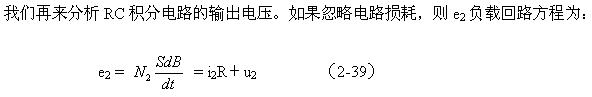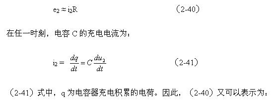 (2-39)式中,i2為流過電阻R的電流,或電容器的充電電流,u2為電容C兩端電壓。與分析變壓器初級線圈中的勵磁電流一樣,如果把積分電路的時間常數取得足夠大,電阻的阻值也取得足夠大,則在一個周期內電容兩端的充電電壓u2相對電阻的電壓降是可以忽略的。則(2-39)式可以改寫為: