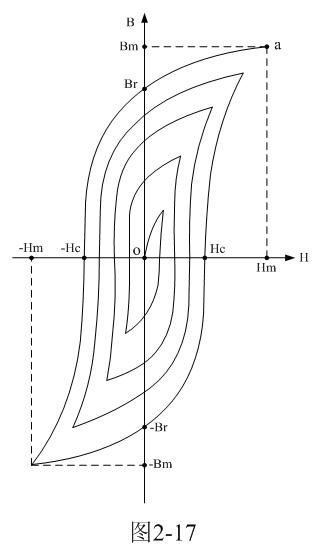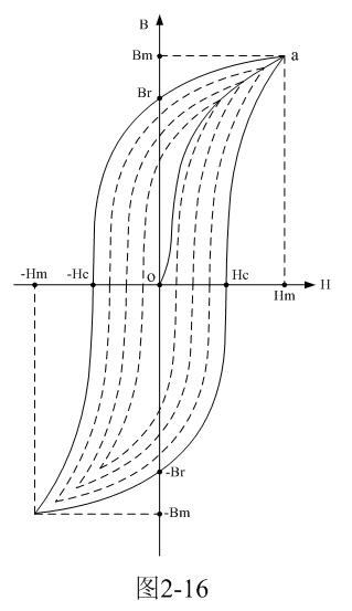 磁矯頑力的大小反映鐵磁材料保持剩磁狀態的能力。圖2-16表明,當磁場按Hm→0→-Hc→-Hm→0→Hc→Hm次序變化時,B所經歷的相應變化為Bm→Br→0→-Bm→-Br→0→Bm。于是得到一條閉合的B~H曲線,稱為磁滯回線。所以,當鐵磁材料處于交變磁場中時(如變壓器中的鐵芯),它將沿磁滯回線反復被磁化→去磁→反向磁化→反向去磁,這個過程周而復始。
