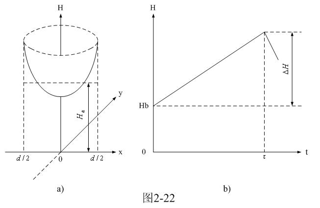 圖2-22-a和圖2-22-b是圓柱形鐵芯中磁場強度按水平分布的函數H(x,y)曲面圖和按時間分布的函數H(t)曲線圖。