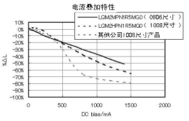 通過直流電流后感值偏執特性良好,可以作為各功率電感的特長。電流-感值偏執特性是指功率電感通電時,電流變大引起感值下降的性質。這是疊層型功率電感的封閉磁路構造導致的磁通量飽和引起的,因此為了克服這個弱點,開發新技術以降低疊層鐵氧體中的磁通量分布,從而改善電流的疊加特性,最后反映在各個產品上。
