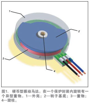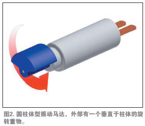 多數(shù)振動(dòng)馬達(dá)由一個(gè)較小的電動(dòng)馬達(dá)驅(qū)動(dòng)一個(gè)偏心配重,如圖1所示。馬達(dá)為直流有刷或無(wú)刷電機(jī),有兩種基本的結(jié)構(gòu):硬幣狀(扁平)與圓柱形(條狀)。