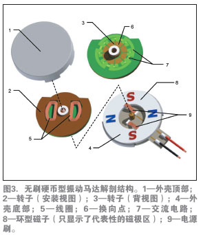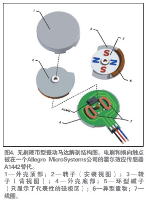 如前所述,無(wú)刷電機(jī)具有較長(zhǎng)的壽命,并由于產(chǎn)生的電火花較少,也沒有了RFI干擾。無(wú)刷直流(BLDC)設(shè)計(jì)還提供業(yè)內(nèi)直徑最小、厚度最薄的扁平振動(dòng)馬達(dá)。圖4介紹了這種馬達(dá)的基本構(gòu)造。