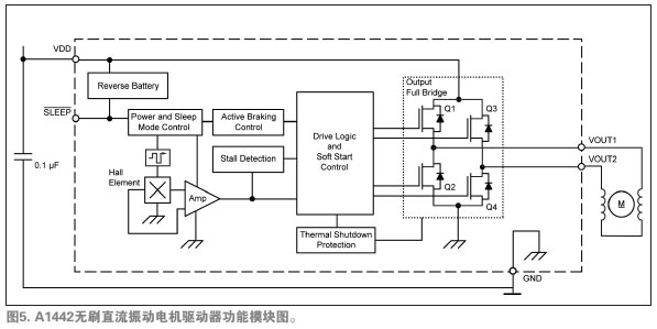 A1442是驅(qū)動(dòng)馬達(dá)唯一必須的的IC。圖5所示的功能模塊圖說(shuō)明了設(shè)備運(yùn)行和先進(jìn)的特性。注意圖4和圖5中,采用集成的霍爾傳感器免除了外部霍爾傳感器,從而減少了馬達(dá)PCB元件數(shù)量。唯一所需的外部元件是一種標(biāo)準(zhǔn)電路特性——位于應(yīng)用馬達(dá)安裝PCB上的0.1µF的旁路電容,它用于降低在開關(guān)電源的電感負(fù)載時(shí)產(chǎn)生的瞬時(shí)電壓峰值。