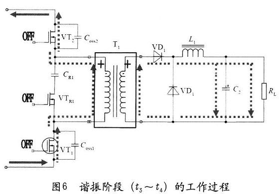其中t1~t2和t3~t4的諧振時間是實現(xiàn)零電壓開關的關健,可以調節(jié)使零電壓開關做到最佳。