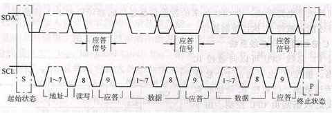 數(shù)據(jù)線上傳輸?shù)目刂菩盘?hào),均按圖3所示的內(nèi)容和順序先后傳輸:起始狀態(tài)信號(hào)、被控電路地址、讀寫方式(數(shù)據(jù)傳輸方向位)、應(yīng)答信號(hào)、數(shù)據(jù)信號(hào)、應(yīng)答信號(hào)、數(shù)據(jù)信號(hào)、應(yīng)答信號(hào)、終止?fàn)顟B(tài)信號(hào)。