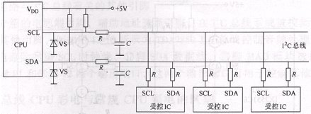 直接式I2C總線是指被控集成電路直接或通過電阻掛在I2C總線上,其電路工作原理圖如圖4所示。因?yàn)镃PU的I2C總線輸出端口內(nèi)部電路形式為集電極開路(或漏極開路)形式,所以在CPU的I2C總線輸出端必須通過上拉電阻R接+5V電源,為CPU的I2C總線輸出端口的內(nèi)部電路供電。圖4中的電阻R為隔離電阻,C為抗干擾電容,主要是為了提高I2C總線上數(shù)據(jù)傳輸?shù)目煽啃裕乐拐`動(dòng)作進(jìn)人維修狀態(tài)和防止由于外部干擾信號(hào)改變I2C總線數(shù)據(jù)。穩(wěn)壓管VS是為了防止外部高電壓損壞CPU的I2C總線輸出端的內(nèi)部電路。