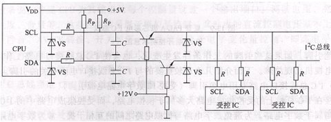 隔離式I2C總線是指CPU引出的總線通過隔離器與被控集成電路相連接。隔離器一般由晶體管組成,其電路工作原理圖如圖5所示。這種電路的優(yōu)點(diǎn)是CPU與被控集成電路被晶體管隔離器隔離開,當(dāng)被控對(duì)象發(fā)生故障使I2C總線上電壓升高時(shí),晶體管會(huì)截止,從而保護(hù)CPU不被高電壓沖擊而損壞。
