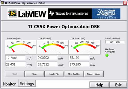 采用LabView和C55電源優(yōu)化DSK(C55PowerOptimizationDSPStarterKit),設(shè)計(jì)小組能?chē)L試采用不同的實(shí)施方案,并用類(lèi)似于圖3所示的GUI工具對(duì)功耗加以調(diào)節(jié)。