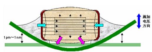 由于陶瓷的強介電性引起的壓電效應,疊層電容在施加交流電之后會向疊層的方向發生伸縮。這是因為介電體一般的泊松比(橫向變形系數)為0.3,如圖2中所示,與疊層方向垂直的方向,即與電路板平行的方向也會發生伸縮,結果導致電路板表面產生振動并能夠聽到聲音。電容器以及電路板的振幅僅為1pm~1nm,但振動聲音已足夠大到我們可以聽見。單個電容器與空氣產生的聲阻抗有所差別,因此若僅是這樣的話應該幾乎是聽不到嘯叫的,然而焊接到電路板上之后,電路板成了聲阻抗變壓器,使振動頻率達到人耳可分辨頻段(20Hz~20kHz)時,就會聽到類似“嘰”的聲音。