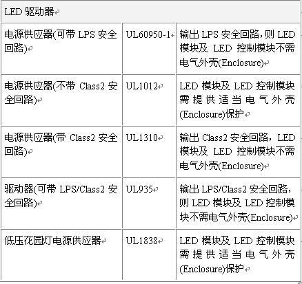 4.其它要求:如LED電源、LED數組、LED模塊及LED控制模塊等安全及外殼要求等。LED的電源可以是下列標準所驗證的電源供應器,包括UL1012,UL1310及UL60950-1?;旧?,LED數組、LED模塊及LED控制模塊只要位于LPS/Class2安全回路上,就沒有任何電氣外殼的要求。LED燈具對于電源輸出方式的規定為基本絕緣,與完全沒有隔離是一樣的。對于LED數組、LED模塊及LED控制模塊,如果使用的電源不用大到超過LPS/Class2,建議最好要符合LPS/Class2。反之,若使用的能量將大于LPS/Class2,則有沒有提供隔離一次側與二次側電源電路的絕緣,對塑料外殼的要求上,是沒有差別的。