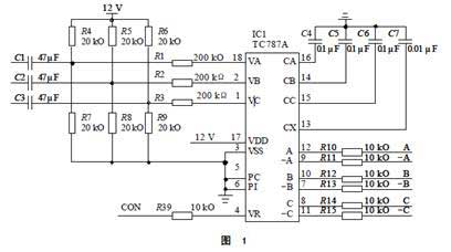 從同步變壓器來的三相過零信號經C1、C2、C3電容耦合到6V的直流信號上送入18、2、1腳。TC787對其進行過零檢測,經積分電容C4、C5、C6形成以過零點為起點的三角波,與由VR引入的觸發控制信號比較,再經C7調制成觸發脈沖,由12、9、10、7、8、11腳輸出,由脈沖變壓器驅動可控硅。