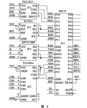 TLC0834是4路8位A/D轉換器,采集1路電壓和3路電流信號;TLC5615是10位串行D/A,將控制量變為模擬電壓信號,去控制可控硅交流調壓;X25045是含WDT和EEPROM的多功能電路,負責單片機系統的安全監視和重要參數的保護;SN75176是RS485接口,實現連網監控。