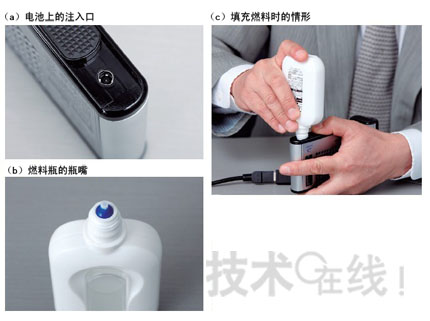 從位于底部的注入口向燃料電池填充燃料(a)。50mL裝燃料瓶由東洋制罐制造(b)。將瓶嘴插入電池的燃料注入口,只有對(duì)準(zhǔn)時(shí),瓶嘴才會(huì)插入注入口里面注入燃料(c)。