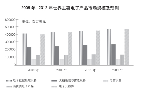 未來(lái)3年內(nèi),電子數(shù)據(jù)處理設(shè)備、電子元器件、無(wú)線通信產(chǎn)品和消費(fèi)類(lèi)電子產(chǎn)品份額仍將占據(jù)世界電子產(chǎn)品份額的前4位。2009年上述4種電子產(chǎn)品所占比例分別是28.18%、27.99%、16.37%、9.20%。其中電子數(shù)據(jù)處理設(shè)備和消費(fèi)類(lèi)電子產(chǎn)品所占份額分別比2008年提高了0.77%和0.33%。未來(lái)3年內(nèi),世界主要電子產(chǎn)品所占份額的比重基本保持穩(wěn)定,電子元器件所占比重略有增加,預(yù)計(jì)將由2009年的27.99%增加到2012年的28.89%,電子數(shù)據(jù)處理設(shè)備將由28.18%增加到28.43%。