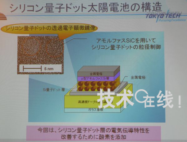 東京工業(yè)大學(xué)教授小長井誠研究小組,大幅提高了利用硅量子點(diǎn)的太陽能電池的開放電壓(Voc)及I-V特性形狀因子(FF)數(shù)值。2010年3月10日,該消息是在應(yīng)用物理學(xué)會(huì)舉行的2010年春季應(yīng)用物理學(xué)會(huì)學(xué)術(shù)演講會(huì)的會(huì)前新聞發(fā)布會(huì)上宣布的。