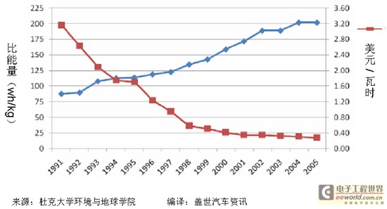 圖1:1991-2005年車用鋰電池能量密度提升和成本下降情況