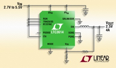 凌力爾特公司 (Linear Technology Corporation) 推出高效率同步降壓型穩壓器 LTC3614,該器件采用恒定頻率、電流模式架構,能夠實現高達 4MHz 的開關頻率。低電阻內部開關允許采用 3mm x 5mm QFN 封裝的 LTC3614 提供高達 4A 的連續輸出電流,而且其低壓差工作允許輸出電壓范圍為 0.6V 至僅比 VIN 低數 mV。LTC3614 在 2.25V 至 5.5V 的輸入電壓范圍內工作,從而非常適用于單節鋰離子電池應用以及 3.3V 或 5V 中間總線系統。其開關頻率從 300kHz 至 4MHz 是用戶可編程的,因而允許使用纖巧、低成本電容器和電感器。