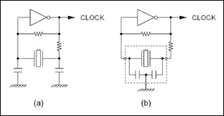 圖1給出了兩個(gè)皮爾斯振蕩器的實(shí)例。圖1a是一個(gè)典型的晶體振蕩電路,使用外部電容和電阻。圖1b則是一個(gè)基于三端陶瓷諧振器的皮爾斯振蕩器,陶瓷諧振器中集成了補(bǔ)償電容。這些設(shè)計(jì)中的每一個(gè)元件的值與工作頻率、供電電壓、反相器的類型、元件類型(晶體或諧振器)以及制造商有關(guān)。