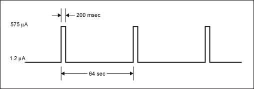 周期性地測量溫度使得器件在短時間內(最差情況下為200ms)的電流損耗增大。圖1給出了DS3231在最差情況下的電流損耗,計算中假設電池電壓為3.63V,I²C兼容接口不工作。