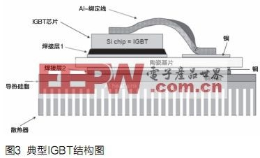 IGBT模塊由多層不同材料組成(見圖3),每種材料具有不同的CTE(熱膨脹系數),CTE的差別會影響功率模塊的使用壽命,當模塊使用時,溫度的變化會在不同層間產生機械應力而導致焊接脫落,我們的目標是選用熱膨脹系數差別盡可能小的材料來進行焊接組合。但另一方面,即使它們的熱膨脹系數十分匹配,因為材料本身的成本可能會太高,或者在生產過程中難以被加工或加工成本太高。例如列車牽引應用中的AlSiC基板。熱膨脹系數和襯底幾乎相同,因此有更好的熱循環(huán)特性。但對混合動力車應用因成本過高而很難被接受。