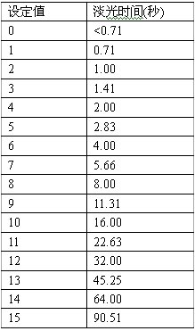 淡光時(shí)間是指由燈功率的某一值變化到燈功率的又一新值時(shí)所需的時(shí)間,利用淡光時(shí)間滑動(dòng)控制條(見(jiàn)主界面圖2)可選擇16個(gè)不同的淡光時(shí)間值(如表2所示)。