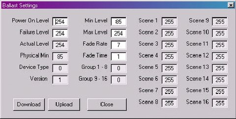 當(dāng)程序第一次加載時(shí),“電子鎮(zhèn)流器設(shè)置(Ballastsetting)”窗口將沒(méi)有數(shù)據(jù)顯示,要完成一只實(shí)際電子鎮(zhèn)流器的設(shè)置,應(yīng)在主界面設(shè)置適應(yīng)的地址,并按下“電子鎮(zhèn)流器設(shè)置(Ballastsetting)”窗口中的“Down/Load”按鈕。
