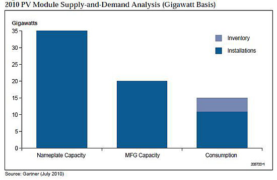 據(jù)市場(chǎng)調(diào)研公司Gartner表示,光伏組件制造商所聲稱(chēng)的”售罄”情形及生產(chǎn)設(shè)備滿(mǎn)負(fù)荷運(yùn)轉(zhuǎn)的情形,與光伏組件實(shí)際的生產(chǎn)供應(yīng)情況極為不符。Gartner表示,光伏組件的實(shí)際生產(chǎn)供應(yīng)量約為20GW至24GW,而2010年預(yù)計(jì)新增安裝量?jī)H為11GW多一點(diǎn)。由于兩個(gè)數(shù)據(jù)并不相互吻合,因此,Gartner擔(dān)憂(yōu)市場(chǎng)將無(wú)法達(dá)到供需平衡。
