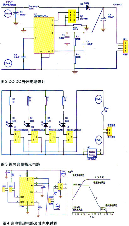 本文論述的電路系統(tǒng)設(shè)計由五部分組成:鋰芯容量指示電路、電芯保護(hù)電路、充電管理電路、DC-DC升壓電路和功能擴(kuò)展電路。鋰芯容量指示電路由XC61CC系列的電壓監(jiān)控芯片組成。電芯保護(hù)電路由過充保護(hù)、過放保護(hù)、過溫保護(hù)三部分組成,HAT2027、R5402、自恢復(fù)保險絲構(gòu)建了三重保護(hù),使鋰芯安全性大大增強(qiáng)。充電管理電路采用了CN3066,將充電過程分為涓流充電、恒流充電、恒壓充電和維護(hù)充電四個部分,使移動隨身電源能夠最大程度地儲備能量。DC-DC升壓電路采用了MAX1771集成芯片,可將鋰芯容量在安全范圍內(nèi)最大限度釋放,達(dá)到對多種數(shù)碼設(shè)備供電的目的。功能擴(kuò)展涵蓋了戶外活動所涉及的常見需求,具有應(yīng)急夜間高亮照、戶外防盜安全警報、野營驅(qū)蚊等功能。