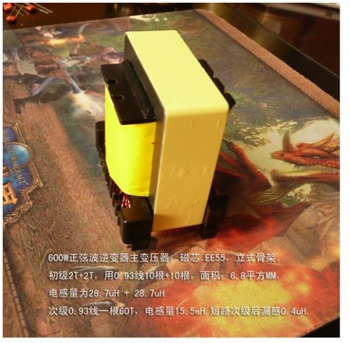 主變壓器是制作逆變器成功與否的關健,本機主變用的磁芯為EE55,材質PC40,我在杭州電子市場買到了一種質量很好的骨架,立式的,腳位11加11,腳粗1.2MM。繞制數據:初級2T加2T,用10根0.93的線。初級導線總面積為6.8平方MM,次級為0.93線一根,繞60T。