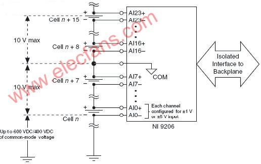 圖2:NI9206能夠承受高達(dá)600V的共模電壓,兩組電池單元之間的隔離也可達(dá)10V