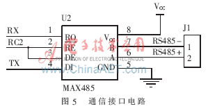 為了使控制器能夠方便地與上層控制平臺(tái)進(jìn)行聯(lián)網(wǎng)通信,實(shí)現(xiàn)控制器的遠(yuǎn)程控制、遠(yuǎn)程監(jiān)控等功能,本設(shè)計(jì)為控制器添加了通信接口,采用簡(jiǎn)單經(jīng)濟(jì)、廣泛應(yīng)用于工業(yè)上的RS485總線與外界進(jìn)行通信。RS485采用差分信號(hào)進(jìn)行傳輸,有較好的抗干擾能力,通過(guò)轉(zhuǎn)換模塊很容易實(shí)現(xiàn)從RS485到RS232的信號(hào)轉(zhuǎn)換,從而便于和上位計(jì)算機(jī)通信。選用了Maxim公司的MAX485芯片作為通信控制的主要器件,其工作電源為+5V,采用半雙工通信方式,能夠?qū)TL電平轉(zhuǎn)換為RS485電平,內(nèi)部包含了1個(gè)驅(qū)動(dòng)器和1個(gè)收發(fā)器,通過(guò)串口可以方便地與PIC16F884進(jìn)行通信。MAX485的接口電路如圖5所示。