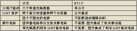 一個單獨的HVIC器件可以集成一個三相門驅動方案所需要的所有6個IGBT門驅動,同時還可將每個高側和低側輸出端的IGBT高端降飽和保護和軟關斷特性集成到一起。表1對HVIC方案和傳統的分立方案進行了比較。