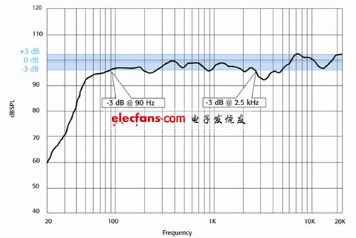 如果說+/-3dB所表示的是平坦特性,而不是頻率響應范圍,那么這個參數對頻率特性而言還有什么意義?回答這個問題前我們可以看一下制造商在典型揚聲器說明書上所標注的“+/-3dB頻響。”