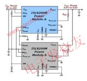 在系統設計周期中,負載電流要求可能會改變,但電源卻不需要改變。ISL8200M可以支持整個溫度范圍從低于10A一直到高達60A的負載電流。每個獨立的電源模塊可以單獨支持10A的輸出電流,但是,通過使用該模塊的專利均流架構,這些模塊可以并聯起來,提供高達60A的輸出電流。所以,一旦在設計中采用了ISL8200M,電源就可以迅速進行修改,以滿足各種不斷變化的應用需求。此外,由于采用了專利的模塊電流共享架構,在一個給定應用需要一個高功率的解決方案時,如果布局限制成為了一個問題,并聯多個ISL8200M模塊將為克服這一挑戰提供靈活性。當輸出電壓調節沒有受到所需的模塊連接布局的影響時,并聯連接模塊的主連接(main connection)解決了布局敏感性的問題。輸出電壓遠端監測和模塊之間的有功電流共享平衡可以降低PCB走線布局的敏感性,所以這種靈活性可用來應對最復雜的電源設計和布局方面的挑戰。