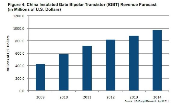 據(jù)IHS iSuppli公司的研究,由于工業(yè)與消費(fèi)領(lǐng)域的需求增長,中國絕緣柵雙極型晶體管(IGBT)市場未來幾年將快速增長,2014年銷售額將從2009年的4.297億美元上升到9.75億美元,增長一倍以上。