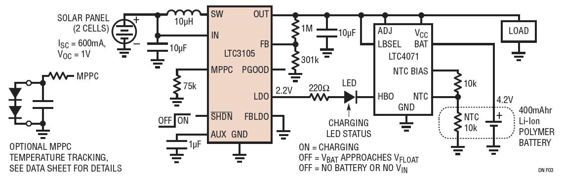 雖然本文描述的電路僅可產(chǎn)生幾百 mW 的功率,但它卻能夠在大多數(shù)天氣條件下提供足以使一個 400mAhr 鋰離子電池保持滿充電狀態(tài)的功率。低輸入電壓與輸入功率控制相結(jié)合,使得 LTC3105 成為低功率太陽能應(yīng)用的理想選擇。此外,LTC4071 并聯(lián)充電系統(tǒng)還通過提供精準(zhǔn)浮置電壓、充電狀態(tài)和溫度安全特性而對 LTC3105 給予了補(bǔ)充,可在室外環(huán)境中確保長久的電池使用壽命。