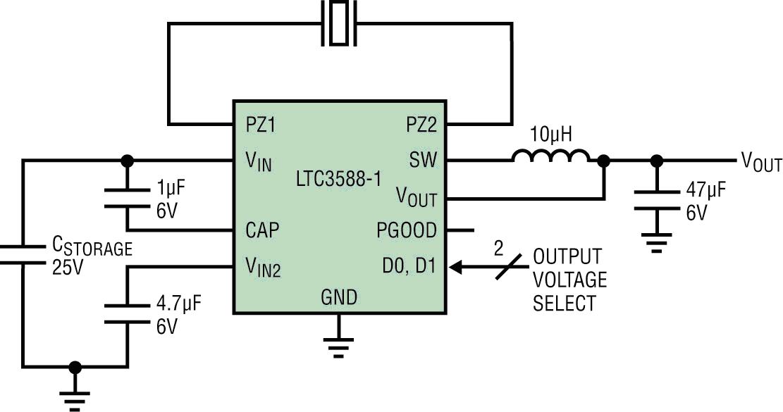LTC3588-1 在 2.7V 至 20V 的輸入電壓范圍內工作,從而非常適用于多種壓電傳感器及其他的高輸出阻抗能量源。其高效率降壓型 DC/DC 轉換器可提供高達 100mA 的連續輸出電流或者甚至更高的脈沖負載。其輸出可以設定為 4 種固定電壓之一 (1.8V、2.5V、3.3V 或 3.6V),以向無線發送器或傳感器供電。輸出處于穩定狀態 (無負載) 時,靜態電流僅為 950nA,從而最大限度地提高了總體效率。